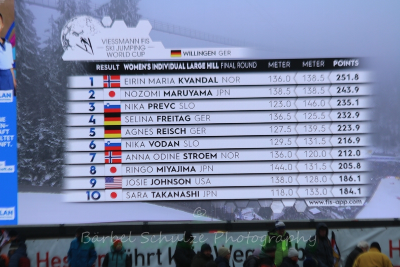 Eirin Maria Kvandal ließ auf ihren gestrigen Sieg am Sonntag gleich den nächsten folgen. Die Norwegerin hatte 7,9 Punkte Vorsprung vor Nozomi Maruyama, der Zweiten. Nika Prevc, die im zweiten Durchgang mit 146 Metern den weitesten Sprung zeigte, wurde Dritte und hatte bereits 16,7 Punkte Rückstand auf den Sieg. Selina Freitag und Agnes Reisch landeten als Vierte und Fünfte knapp hinter den Podestplätzen. Katharina Schmid auf ihrer Abschiedstour verpasste als Elfte die Top Ten knapp.
