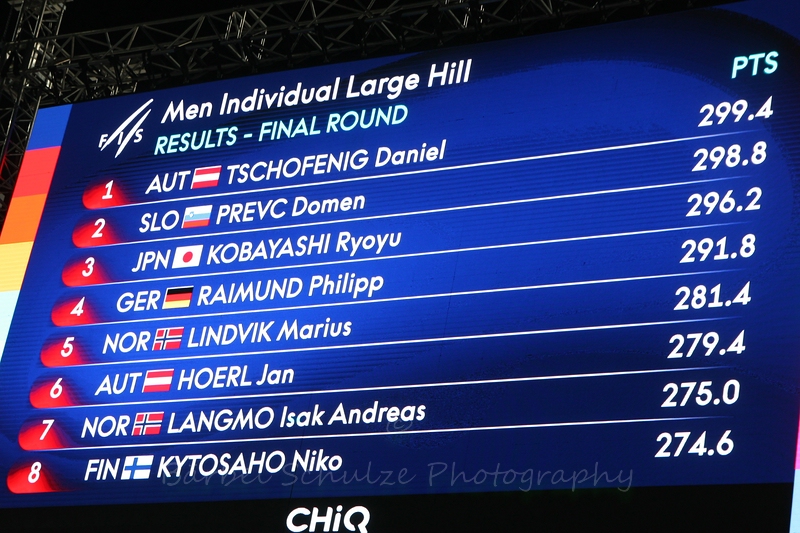 Den Sieg am Samstag in Lahti holte sich Daniel Tschofenig, der am Vortag bereits als Zweiter auf dem Podest stand. Knappe 0,6 Punkte Vorsprung reichten dem Österreicher, um Domen Prevc auf Rang zwei zu verweisen. Platz drei holte sich der Japaner Ryoyu Kobayashi. Vortagessieger Philipp Raimund wurde Vierter.