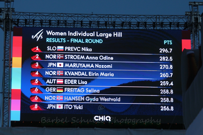 Nika Prevc sicherte sich den heutigen Sieg mit über 14 Punkten Vorsprung und feierte zugleich ihren 15. Sieg in dieser Saison. Platz zwei holte sich Olympiasiegerin Anna Odine Stroem, die auch die Qualifikation gewann. Dritte wurde die Japanerin Nozomi Maruyama.
